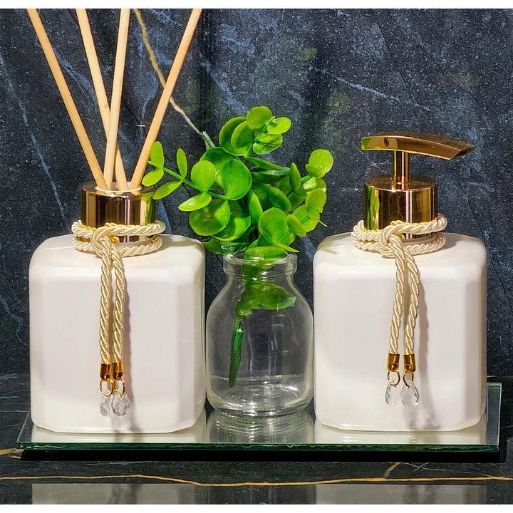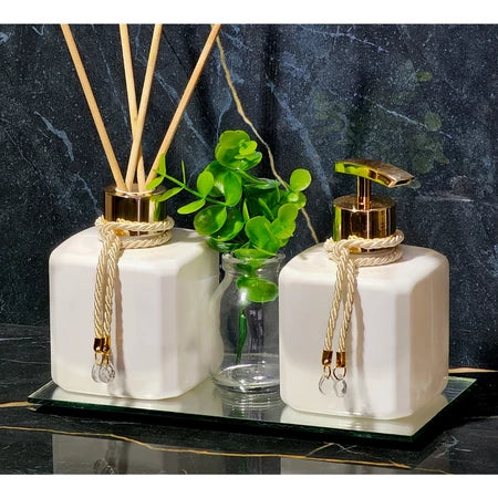 Os frascos são confeccionados em plástico de alta qualidade, o que torna o kit seguro para quem tem crianças em casa. A bandeja espelhada com pés ocultos dá o toque final de luxo e requinte à decoração.