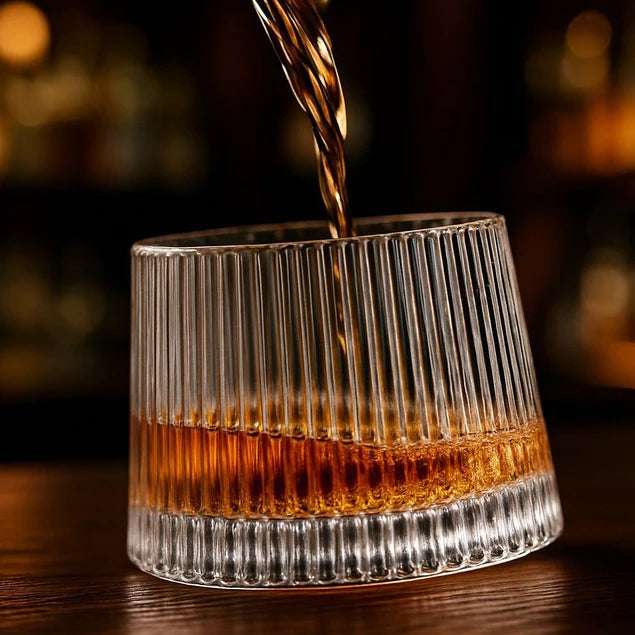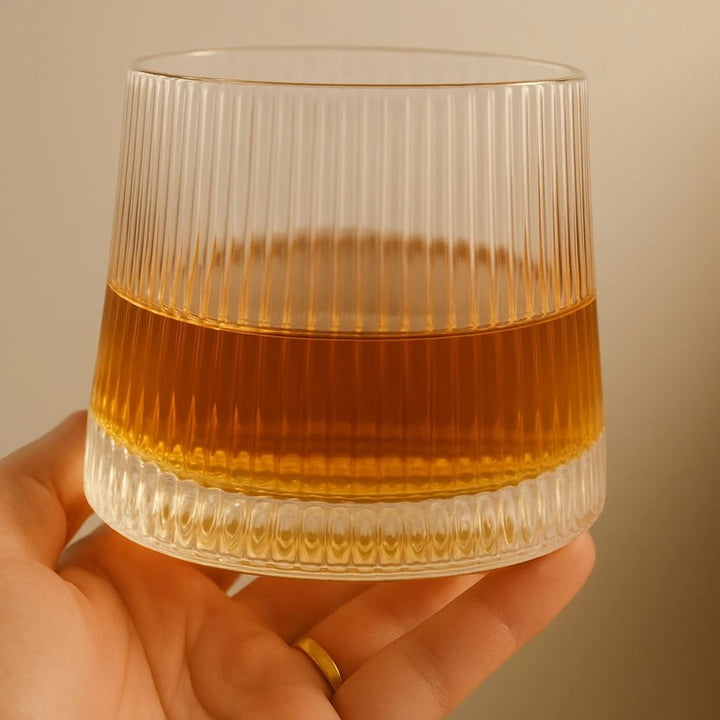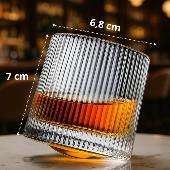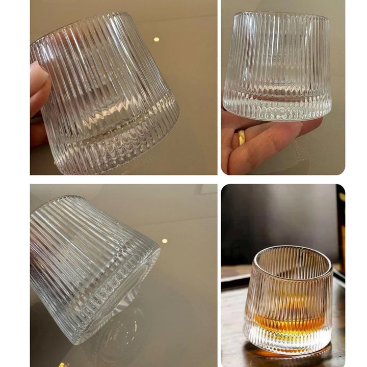 Mais do que um item de utilidade, esses copos elevam a experiência de degustação. O fundo giratório proporciona movimento, charme e interação, tornando cada gole uma experiência completa. O design listrado adiciona elegância e conforto ao toque.