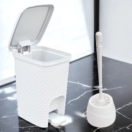 Ideal para quem busca funcionalidade e beleza no mesmo produto, o kit inclui uma lixeira com pedal de 7 litros que permite abertura sem o uso das mãos e uma escova sanitária com suporte, que garante mais praticidade e higiene na rotina diária.