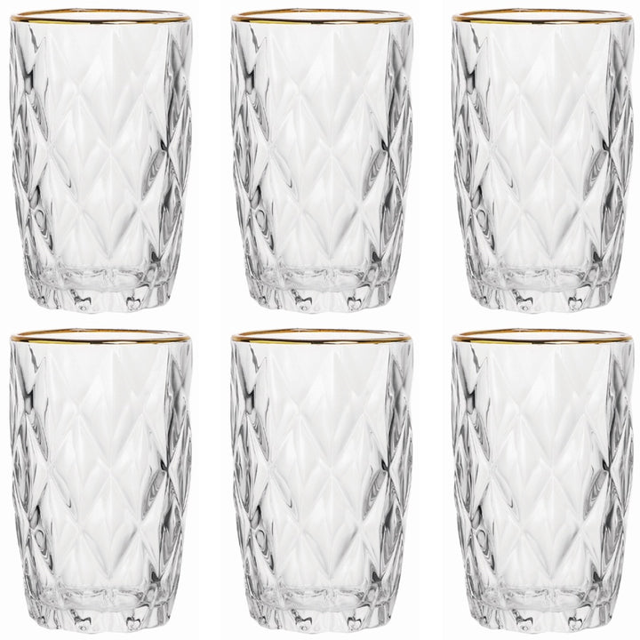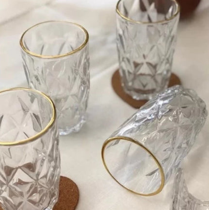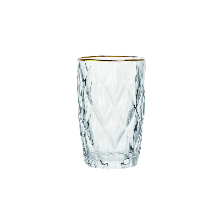 Transforme seus momentos em verdadeiras experiências com o Jogo de Copos Diamond. Cada copo apresenta um design moderno com borda dourada refinada, perfeito para quem aprecia bom gosto, estilo e requinte em cada detalhe.