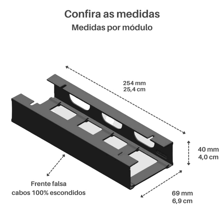 Fabricado em material ABS resistente com acabamento texturizado, o guia de cabos possui design modulado que permite montagem de acordo com a necessidade do usuário — seja para rotas retas ou curvas. Ideal para instalação sob mesas, bancadas ou tampos laterais.