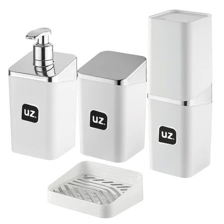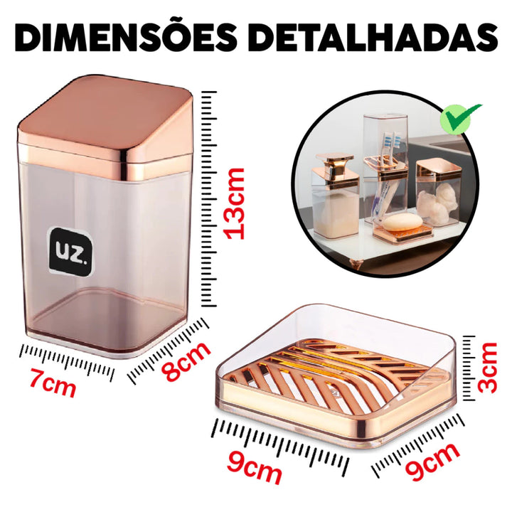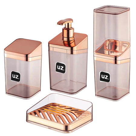 Transforme seu lavabo em um oásis de sofisticação com o Porta Escova de Dente Kit 4 Peças. Conjunto elegante e funcional, ideal para uso diário ou como presente. Acabamento inspirado em Rose Gold e material resistente em plástico PP.
