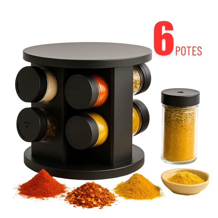 1 Porta Temperos Giratório 6 Potes de vidro com tampa dosadora, conforme a variação escolhida.